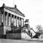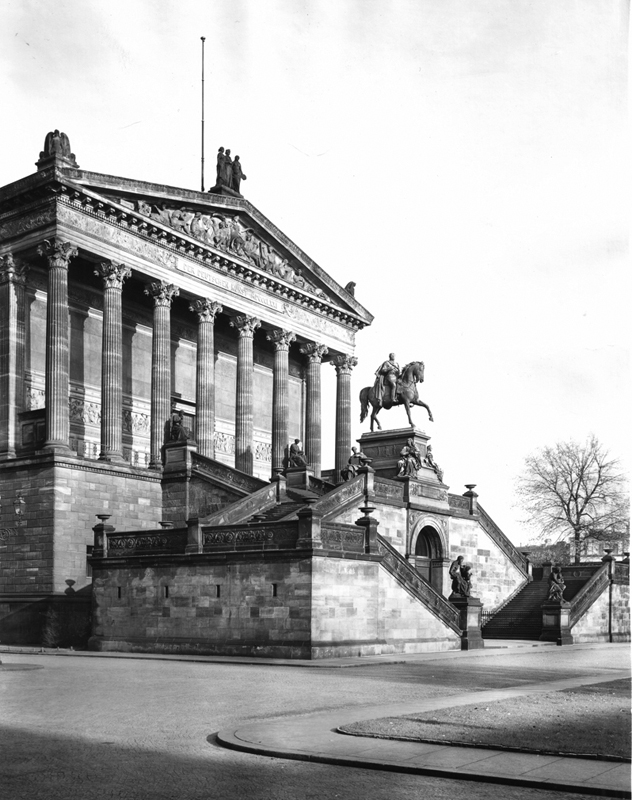 Die Alte Nationalgalerie wurde als Museum in Form eines römischen Tempels 1867-76 nach den Plänen von Stüler durch Busse und Strack auf der Museumsinsel errichtet. Die große Freitreppe und die Fläche des Portikus mit ihrem figürlichen Sandsteinfries, der Granitimitationsfläche und dem venizianischen Glasmosaik wiesen große Schäden auf. Auch war die Kassettendecke mit ihren profilierten reich gestalteten Eisenträgern schadhaft. Aus der Dokumentation und der Schadensanalyse entstand ein Maßnahmekonzept zu Abdichtung der Freitreppe und zur Restaurierung der Portikusflächen. Letzteres wurde zunächst ausgeführt. Die Granitimitationsfläche entstand nach Vorbild mit 7 Putzschichten, wobei die letzte mit Marmormehl und Quarzglimmer versetzt wurde, um dem Original so nah wie möglich zu kommen. Das Venizianische Glasmosaik erhielt eine Reinigung und Festigung. Der figürliche Sandsteinfries wurde gereinigt. Die Kassettendecke wurde repariert und neu nach Vorbild gefaßt sowie die Eisenträger nach einem Rostschutzverfahren gemäß der restauratorischen Untersuchungen gestrichen.