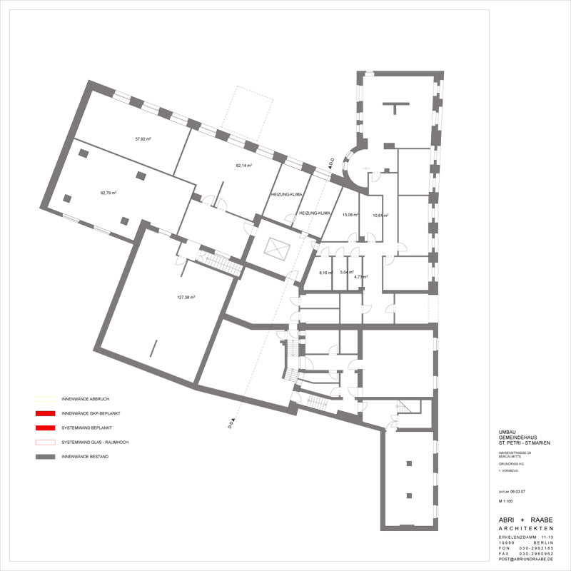Das ehemalige Waisenhaus wurde nach der Wende von der Humboldt-Universität als Hochschuleinrichtung und Bibliothek genutzt. Den damaligen Umbau führten 1992-95 die Architekten Langeheinecke und Claussen durch.In den Jahren 2006 und 2007 wurde eine erneute Nutzungsänderung und damit der komplette innere Umbau des Gebäudes beschlossen. Die Beauftragung unseres Büros erfolgte 2005. Eingerichtet wurden ein Gemeindezentrum, die Subtur und das Kirchliche Verwaltungsamt für den Bezirk Berlin-Mitte.