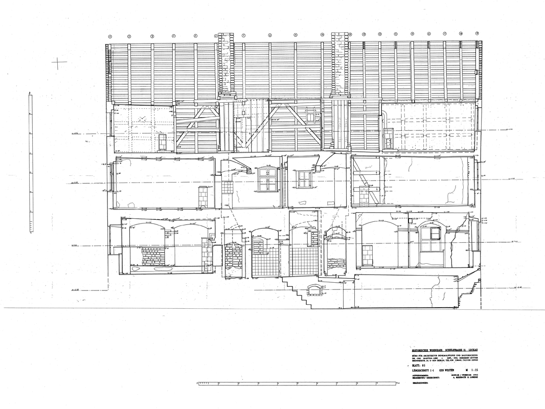 Es wurde eine Bauaufnahme der Genauigkeitsstufe 3 angefertigt, es entstanden Grundrisse und Längs und Querschnitte.